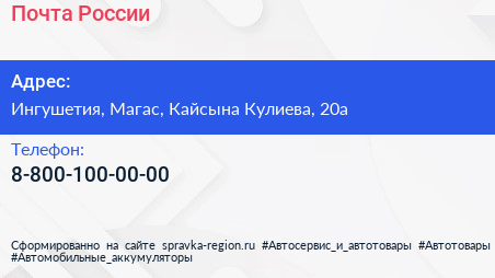 Почта России по адресу Ингушетия, Магас, Кайсына Кулиева, 20а в дальнейшем Организация, размещена в следующих категориях: