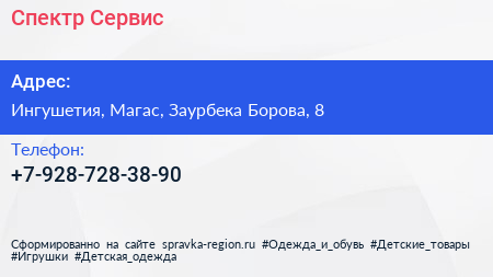 Спектр Сервис по адресу Ингушетия, Магас, Заурбека Борова, 8 в дальнейшем Организация, размещена в следующих категориях: