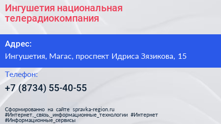 Ингушетия, национальная телерадиокомпания по адресу Ингушетия, Магас, проспект Идриса Зязикова, 15 в дальнейшем Организация, размещена в следующих категориях: