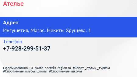 Ателье по адресу Ингушетия, Магас, Никиты Хрущёва, 1 в дальнейшем Организация, размещена в следующих категориях: