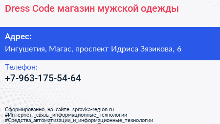 Dress Code, магазин мужской одежды по адресу Ингушетия, Магас, проспект Идриса Зязикова, 6 в дальнейшем Организация, размещена в следующих категориях: