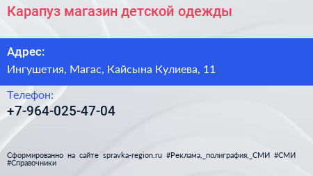 Карапуз, магазин детской одежды по адресу Ингушетия, Магас, Кайсына Кулиева, 11 в дальнейшем Организация, размещена в следующих категориях: