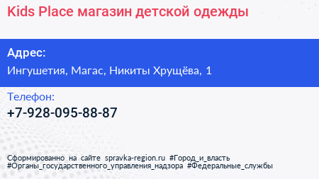 Kids` Place, магазин детской одежды по адресу Ингушетия, Магас, Никиты Хрущёва, 1 в дальнейшем Организация, размещена в следующих категориях: