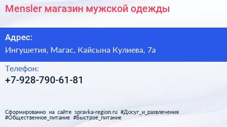 Mensler, магазин мужской одежды по адресу Ингушетия, Магас, Кайсына Кулиева, 7а в дальнейшем Организация, размещена в следующих категориях: