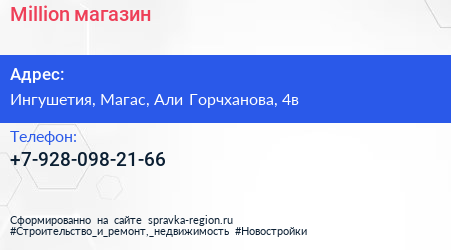 Million, магазин по адресу Ингушетия, Магас, Али Горчханова, 4в в дальнейшем Организация, размещена в следующих категориях: