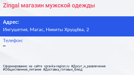 Zingal, магазин мужской одежды по адресу Ингушетия, Магас, Никиты Хрущёва, 2 в дальнейшем Организация, размещена в следующих категориях: