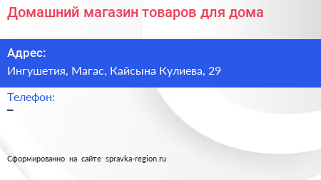 Домашний, магазин товаров для дома по адресу Ингушетия, Магас, Кайсына Кулиева, 29 в дальнейшем Организация, размещена в следующих категориях: