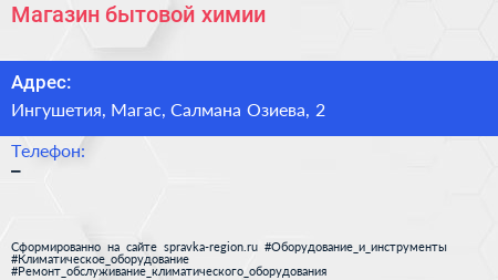 Магазин бытовой химии по адресу Ингушетия, Магас, Салмана Озиева, 2 в дальнейшем Организация, размещена в следующих категориях: