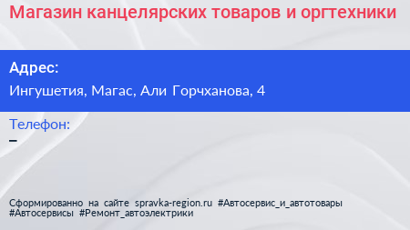 Магазин канцелярских товаров и оргтехники по адресу Ингушетия, Магас, Али Горчханова, 4 в дальнейшем Организация, размещена в следующих категориях: