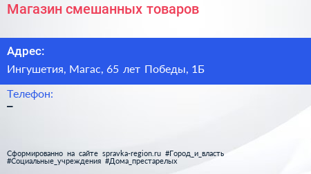 Магазин смешанных товаров по адресу Ингушетия, Магас, 65 лет Победы, 1Б в дальнейшем Организация, размещена в следующих категориях: