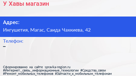 У Хавы, магазин по адресу Ингушетия, Магас, Саида Чахкиева, 42 в дальнейшем Организация, размещена в следующих категориях: