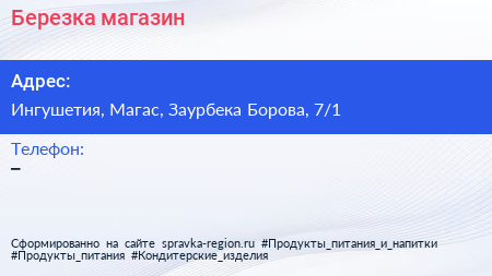 Березка, магазин по адресу Ингушетия, Магас, Заурбека Борова, 7/1 в дальнейшем Организация, размещена в следующих категориях: