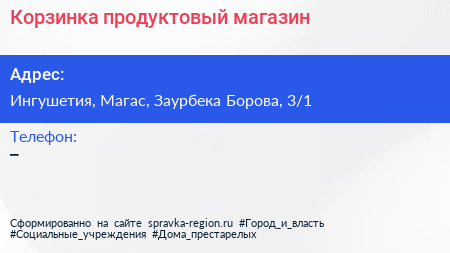 Корзинка, продуктовый магазин по адресу Ингушетия, Магас, Заурбека Борова, 3/1 в дальнейшем Организация, размещена в следующих категориях: