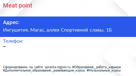 Meat point по адресу Ингушетия, Магас, аллея Спортивной славы, 1Б в дальнейшем Организация, размещена в следующих категориях: