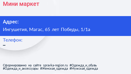 Мини-маркет по адресу Ингушетия, Магас, 65 лет Победы, 1/1а в дальнейшем Организация, размещена в следующих категориях:
