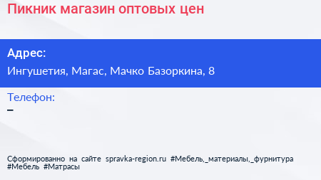 Пикник, магазин оптовых цен по адресу Ингушетия, Магас, Мачко Базоркина, 8 в дальнейшем Организация, размещена в следующих категориях: