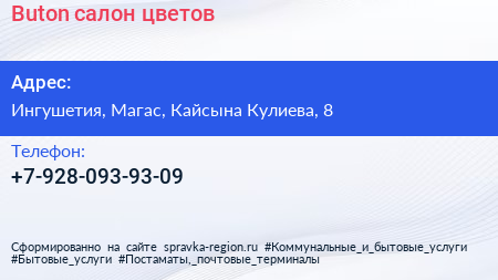 Buton, салон цветов по адресу Ингушетия, Магас, Кайсына Кулиева, 8 в дальнейшем Организация, размещена в следующих категориях: