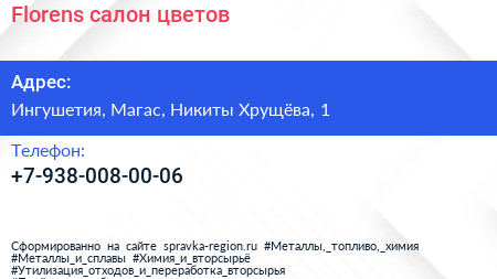 Florens, салон цветов по адресу Ингушетия, Магас, Никиты Хрущёва, 1 в дальнейшем Организация, размещена в следующих категориях: