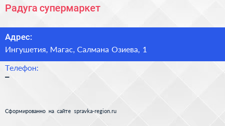 Радуга, супермаркет по адресу Ингушетия, Магас, Салмана Озиева, 1 в дальнейшем Организация, размещена в следующих категориях: