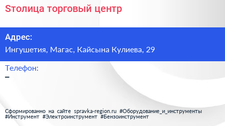 Sтолица, торговый центр по адресу Ингушетия, Магас, Кайсына Кулиева, 29 в дальнейшем Организация, размещена в следующих категориях: