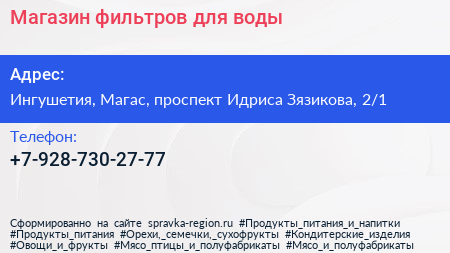 Магазин фильтров для воды по адресу Ингушетия, Магас, проспект Идриса Зязикова, 2/1 в дальнейшем Организация, размещена в следующих категориях: