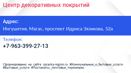 Центр декоративных покрытий по адресу Ингушетия, Магас, проспект Идриса Зязикова, 52а в дальнейшем Организация, размещена в следующих категориях: