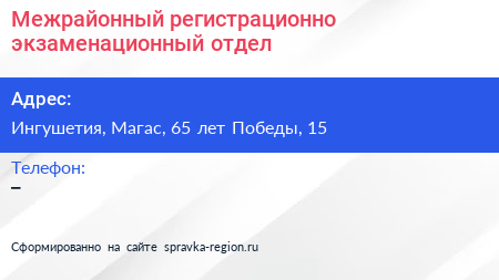 Межрайонный регистрационно-экзаменационный отдел по адресу Ингушетия, Магас, 65 лет Победы, 15 в дальнейшем Организация, размещена в следующих категориях: