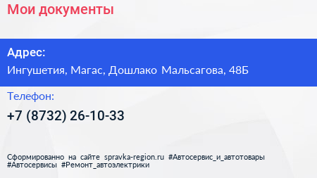 Мои документы по адресу Ингушетия, Магас, Дошлако Мальсагова, 48Б в дальнейшем Организация, размещена в следующих категориях: