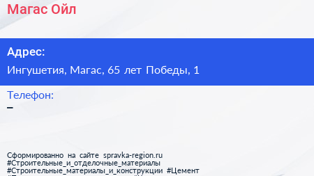 Магас Ойл по адресу Ингушетия, Магас, 65 лет Победы, 1 в дальнейшем Организация, размещена в следующих категориях: