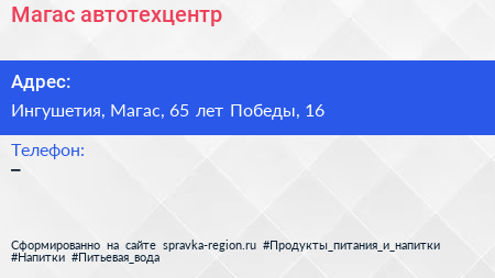 Магас, автотехцентр по адресу Ингушетия, Магас, 65 лет Победы, 16 в дальнейшем Организация, размещена в следующих категориях: