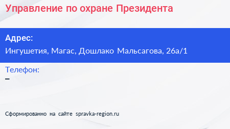 Управление по охране Президента по адресу Ингушетия, Магас, Дошлако Мальсагова, 26а/1 в дальнейшем Организация, размещена в следующих категориях: