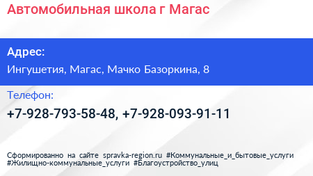 Автомобильная школа г. Магас по адресу Ингушетия, Магас, Мачко Базоркина, 8 в дальнейшем Организация, размещена в следующих категориях: