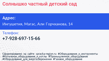 Солнышко, частный детский сад по адресу Ингушетия, Магас, Али Горчханова, 14 в дальнейшем Организация, размещена в следующих категориях: