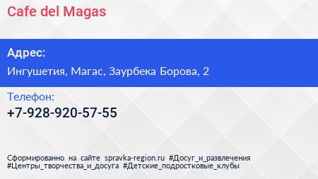 Cafe del Magas по адресу Ингушетия, Магас, Заурбека Борова, 2 в дальнейшем Организация, размещена в следующих категориях: