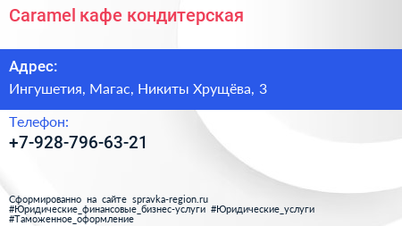 Caramel, кафе-кондитерская по адресу Ингушетия, Магас, Никиты Хрущёва, 3 в дальнейшем Организация, размещена в следующих категориях: