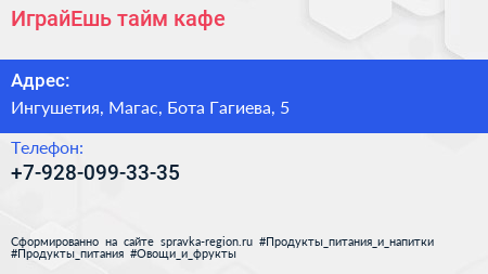 ИграйЕшь, тайм-кафе по адресу Ингушетия, Магас, Бота Гагиева, 5 в дальнейшем Организация, размещена в следующих категориях: