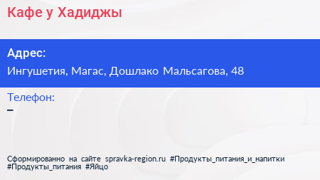 Кафе у Хадиджы по адресу Ингушетия, Магас, Дошлако Мальсагова, 48 в дальнейшем Организация, размещена в следующих категориях: