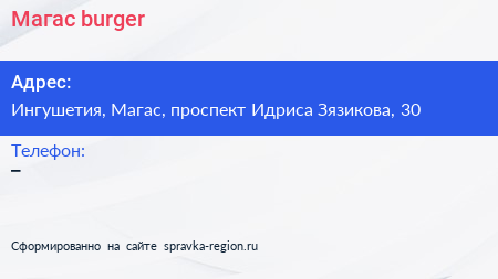 Магас burger по адресу Ингушетия, Магас, проспект Идриса Зязикова, 30 в дальнейшем Организация, размещена в следующих категориях: