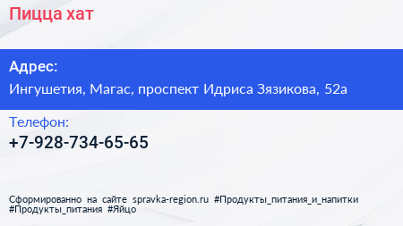 Пицца хат по адресу Ингушетия, Магас, проспект Идриса Зязикова, 52а в дальнейшем Организация, размещена в следующих категориях: