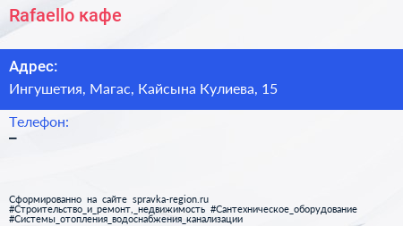 Rafaello, кафе по адресу Ингушетия, Магас, Кайсына Кулиева, 15 в дальнейшем Организация, размещена в следующих категориях: