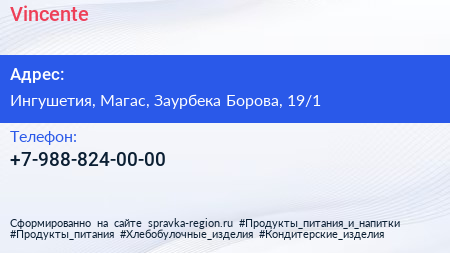 Vincente по адресу Ингушетия, Магас, Заурбека Борова, 19/1 в дальнейшем Организация, размещена в следующих категориях: