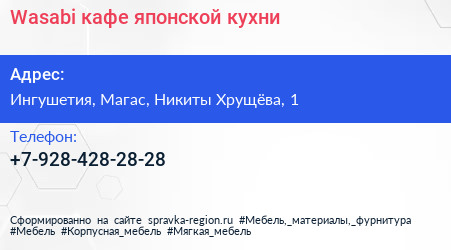 Wasabi, кафе японской кухни по адресу Ингушетия, Магас, Никиты Хрущёва, 1 в дальнейшем Организация, размещена в следующих категориях: