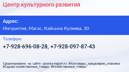 Центр культурного развития по адресу Ингушетия, Магас, Кайсына Кулиева, 30 в дальнейшем Организация, размещена в следующих категориях: