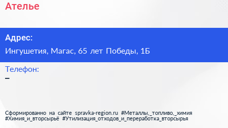 Ателье по адресу Ингушетия, Магас, 65 лет Победы, 1Б в дальнейшем Организация, размещена в следующих категориях: