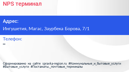 NPS, терминал по адресу Ингушетия, Магас, Заурбека Борова, 7/1 в дальнейшем Организация, размещена в следующих категориях:
