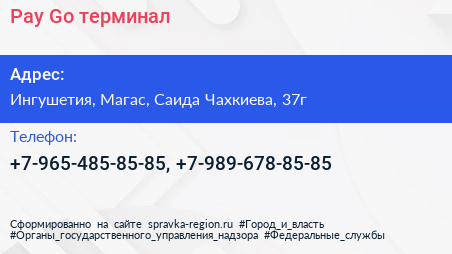 Pay & Go, терминал по адресу Ингушетия, Магас, Саида Чахкиева, 37г в дальнейшем Организация, размещена в следующих категориях: