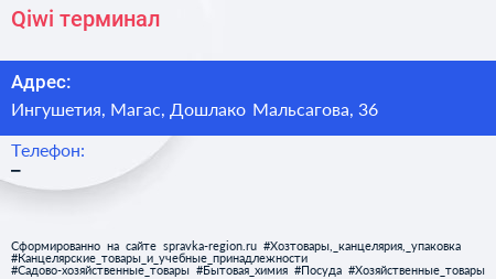 Qiwi, терминал по адресу Ингушетия, Магас, Дошлако Мальсагова, 36 в дальнейшем Организация, размещена в следующих категориях:
