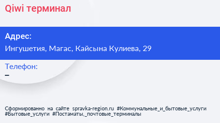 Qiwi, терминал по адресу Ингушетия, Магас, Кайсына Кулиева, 29 в дальнейшем Организация, размещена в следующих категориях: