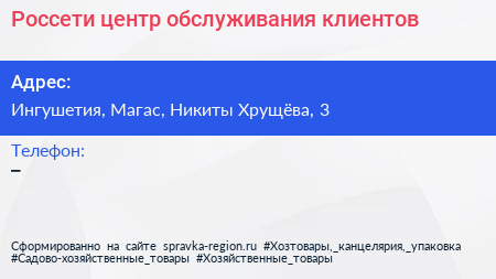 Россети, центр обслуживания клиентов по адресу Ингушетия, Магас, Никиты Хрущёва, 3 в дальнейшем Организация, размещена в следующих категориях: