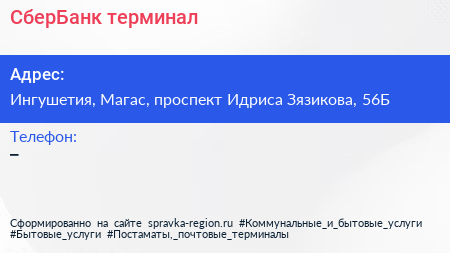 СберБанк, терминал по адресу Ингушетия, Магас, проспект Идриса Зязикова, 56Б в дальнейшем Организация, размещена в следующих категориях: